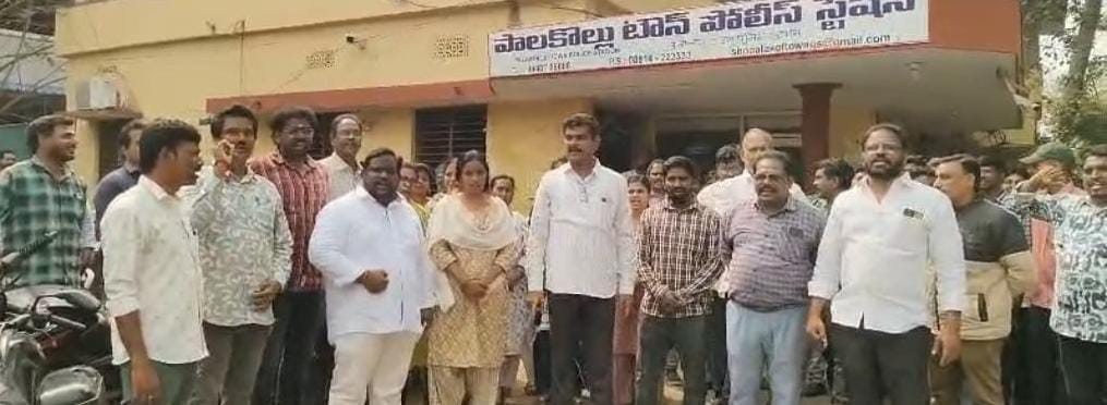 పోలీస్ స్టేషన్ వద్ద నిరసన తెలుపుతున్న ఉద్యోగ సంఘ నాయకులు.