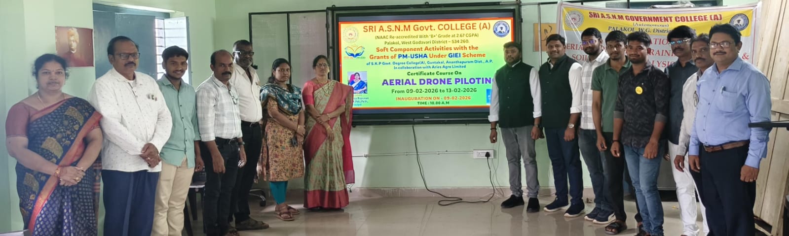 పాలకొల్లు: ఫిబ్రవరి,9(తెలుగు న్యూస్ పవర్) స్థానిక శ్రీ అద్దేపల్లి సత్యనారాయణమూర్తి ప్రభుత్వ (స్వయం ప్రతిపత్తి) కళాశాలలో విద్యార్థుల్లో ఉపాధి నైపుణ్యాలు, వ్యాపార దృక్పథం మరియు స్వయం ఉపాధి అవకాశాలను పెంపొందించడమే లక్ష్యంగా, ఎస్.కె.పి. ప్రభుత్వ డిగ్రీ కళాశాల (అటానమస్), గుంతకల్లు, అనంతపురం జిల్లా వారి ఆర్థిక సహకారంతో, పీఎం–ఉషా జి.ఐ.ఈ. ఐ స్కీంలో భాగంగా ఏరీస్ ఆగ్రో లిమిటెడ్ ముంబై, కళాశాల ఎన్ఎస్ఎస్ యూనిట్–I, II మరియు మహిళా సాధికారతా విభాగం వారి ఆధ్వర్యంలో బాలికలకు ప్రత్యేక శిక్షణ 5 రోజుల ఏరియల్ డ్రోన్ పైలట్ ట్రైనింగ్, రసాయన శాస్త్ర విభాగం మరియు మహిళా సాధికారతా విభాగం వారు 2 రోజుల భూసార పరీక్షల నైపుణ్యం కోర్సులు ప్రారంభోత్సవం ఘనంగా నిర్వహించబడింది.