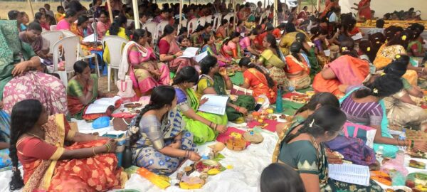 శ్రీ చక్ర పూజలో పాల్గొన్న మహిళాభక్తులు.