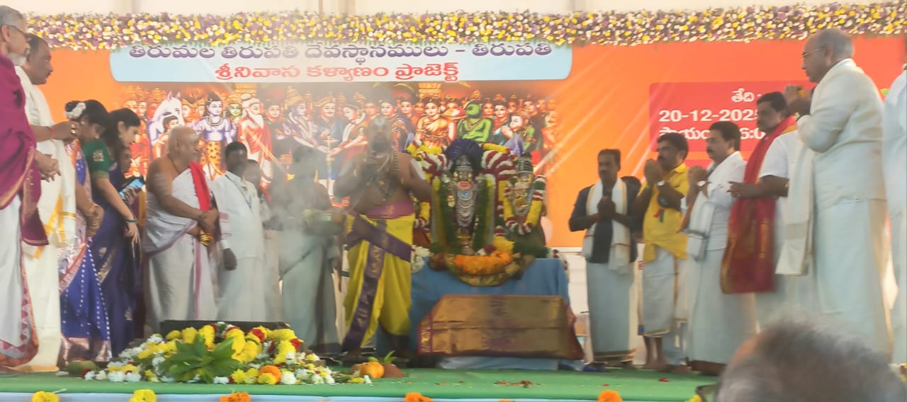 పాలకొల్లు:డిసెంబర్,20 (తెలుగు న్యూస్ పవర్) ఉభయ గోదావరి జిల్లాల గోవింద మాల కళ్యాణోత్సవ కమిటీ ఆధ్వర్యంలో తిరుమల తిరుపతి దేవస్థానం కళ్యాణోత్సవ విగ్రహాలతో శనివారం రాత్రి ఆర్ఆర్ రైస్ మిల్ ప్రాంగణంలో ఈ ఉత్సవం జరిగింది. తిరుపతి నుంచి వచ్చిన పండితులు, ఇతర ప్రముఖ అర్చకులు ఈ కళ్యాణం ఉత్సవం వైభవంగా జరిపించారు.ఈ కళ్యాణోత్సవంలో కాస్మో కల్చరల్ స్పోర్ట్స్ క్లబ్ అధ్యక్షులు గాంధీ భగవాన్ రాజు దంపతులు, కాటంరెడ్డి సత్యనారాయణ దంపతులు జరిపించారు. ఈ సందర్భంగా ఉదయం దేవరపల్లి రామకృష్ణ దంపతులచే గణపతి హోమం జరిపించారు. కాటంరెడ్డి సత్యనారాయణ దంపతులు, నంబూరి భాగ్యలక్ష్మి ఆధ్వర్యంలో సామూహిక శ్రీ చక్ర పూజ జరిగింది. కన్నుల పండుగగా జరిగిన ఈ కళ్యాణోత్సవం లో వేలమంది భక్తులు పాల్గొని,చూసి తరించారు. ప్రత్యక్షంగా ఈ దివ్య కళ్యాణం తిలకించడంలో భక్తులు పులకించిపోయారు. కళ్యాణోత్సవం అనంతరం భక్తులకు అల్పాహార ప్రసాదం, తిరుపతి ప్రసాదాలు వితరణ చేశారు. భక్తులకు తిరునామం తిలకం దిద్దటం ఈ కార్యక్రమానికి మరింత శోభ తెచ్చింది. భారీ గుడారం ఏర్పాటు, భక్తులకు చలి, మంచు నుంచి రక్షణ కల్పించింది. ఈ కార్యక్రమంలో గురు స్వామి యాదంరెడ్డి సత్యం, మేడికొండ శ్రీనివాస్, కటారి నాగేంద్ర కుమార్, కలిదిండి కృష్ణ వర్మ, కాటంరెడ్డి సత్యనారాయణ, గాదంశెట్టి సతీష్, తదితర కమిటీ సభ్యులు ఏర్పాట్లు పర్యవేక్షించారు. తిరుపతి ధర్మకర్తల మండలి మాజీ సభ్యులు మేకా శేషుబాబు, ఏఎంసీ చైర్మన్ కోడి విజయభాస్కర్, విజయవాడ కనకదుర్గమ్మ దేవస్థానం మాజీ ట్రస్ట్ బోర్డ్ సభ్యులు బీరక ప్రసాద్, ఆర్ఆర్ రైస్ మిల్ అధినేత భూపతిరాజు రాజు, సోమరాజు, తటవర్తి కృష్ణమూర్తి, , తోట ఈశ్వర్,మారెళ్ళ మాణిక్యాలరావు తదితరులు, గోవింద మాల కమిటీ సభ్యులు, భక్తులు పాల్గొన్నారు.