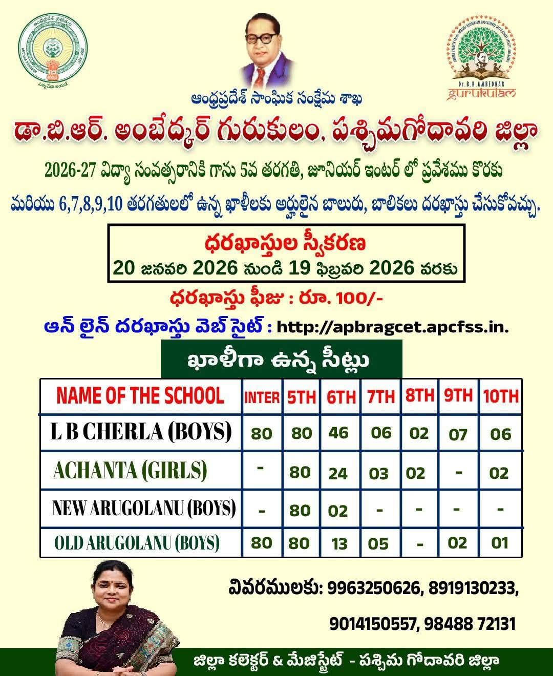 భీమవరం: ఫిబ్రవరి, 7(తెలుగు న్యూస్ పవర్) డాక్టర్ బి.ఆర్ అంబేద్కర్ గురుకుల పాఠశాలలో ప్రవేశాలకు దరఖాస్తు చేసుకోవాలని జిల్లా కలెక్టర్ చదలవాడ నాగరాణి ఒక ప్రకటనలో కోరారు. ఈ విద్యా సంవత్సరం,(26-27) ప్రవేశాల కొరకు దరఖాస్తులు ఈనెల 19 వరకు స్వీకరిస్తారు. దరఖాస్తుదారులు100 రూపాయల ఫీజు చెల్లించాలి. గురుకుల పాఠశాలలో 5వ తరగతి, ఇంటర్ మొదటి సంవత్సరం ప్రవేశాలకు దరఖాస్తు చేసుకోవాలి. ప్రస్తుతం ఖాళీ ఉన్న 6 నుంచి 10 తరగతులకు కూడా దరఖాస్తు చేసుకోవచ్చునని,ఆ ప్రకటనలు వివరించారు. వివరాలకు: 9014150557/9848872131 నంబర్లను సంప్రదించవచ్చు.