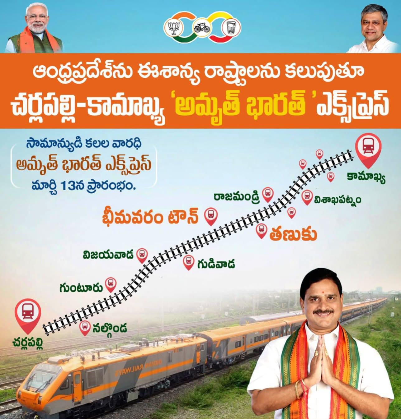 చర్లపల్లి (హైదరాబాద్) కామాఖ్య (గౌహతి – అస్సాం) అమృత్ భారత్ ఎక్స్ప్రెస్ ఆంధ్రప్రదేశ్ను ఈశాన్య భారతంతో అనుసంధానిస్తూ, సామాన్య ప్రయాణికుల చిరకాల వాంఛను నెరవేరుస్తోంది. ఈ నూతన రైలు సర్వీసు. ప్రధాని నరేంద్ర మోదీ నాయకత్వంలో, భారతీయ రైల్వే అత్యంత ఆధునిక సాంకేతికతతో ఈ “అమృత్ భారత్ ఎక్స్ప్రెస్”ను ప్రయాణికులకు అందుబాటులోకి తీసుకువచ్చింది.ఈ రైలు ద్వారా పశ్చిమగోదావరి జిల్లా నుంచి రాజమండ్రి, వైజాగ్ వెళ్లే ప్రయాణికులకు అత్యంత వేగవంతమైన, సౌకర్యాలతో కూడిన ప్రయాణం అందుబాటులోకి వస్తుంది.