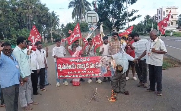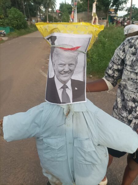 దుర్మార్గపు సామ్రాజ్యవాద కాంక్ష పై ప్రజాసంఘాలు తీవ్ర ఆగ్రహం వ్యక్తం చేశాయి. యలమంచిలి మండలం చించినాడ, ఏనుగువాని లంక, కట్టుపాలెం గ్రామకూడల్లలో ట్రంప్ దిష్టి బొమ్మ దహనం చేసి సోమవారం మధ్యాహ్నం ప్రజాసంఘాలు నిరసన తెలిపాయి. వాణిజ్య విలువల్ని తుంగలో త్రొక్కి, బెదిరింపు ధోరణిలో తమ దేశ వ్యవసాయ ఉత్పత్తులను దిగుమతి చేసుకోవాలనే ఒత్తిడి వల్ల భారత వ్యవసాయ రంగం పలుఒడిదుడుకుల పాలవుతుందన్నారు. కక్ష సాధింపు సుంకాలు బేషరతుగా రద్దు చేయాలని వారు డిమాండ్ చేశారు. ఈ నిరసన కార్యక్రమంలో సీ పీ ఎం పార్టీ వివిధ శాఖల నాయకులు దేవ సుధాకర్, ఆంజనేయ స్వామి, బాతిరెడ్డి జార్జ్, తానేటి బాలరాజు, మాచవరపు సుబ్బారావు, వర్ల ఏడుకొండలు, మోహనరావు, పలువురు కార్యకర్తలు పాల్గొన్నారు.
