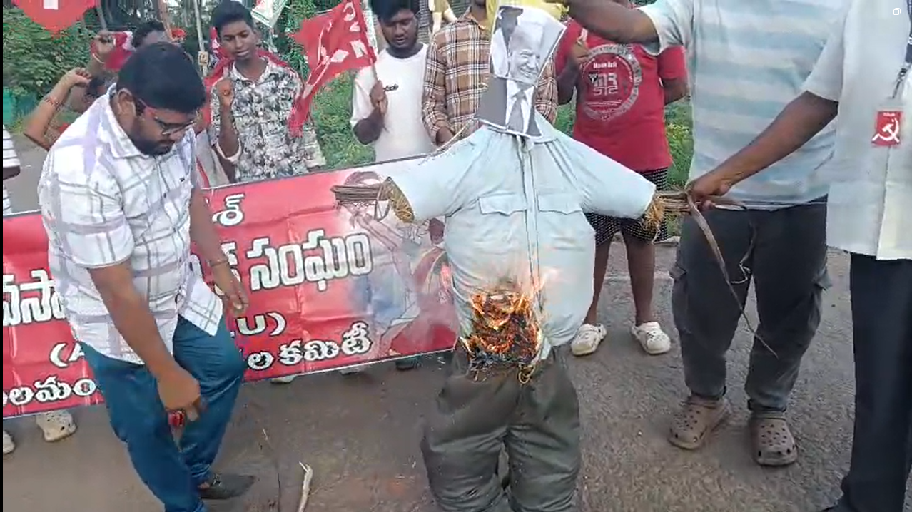 దుర్మార్గపు సామ్రాజ్యవాద కాంక్ష పై ప్రజాసంఘాలు తీవ్ర ఆగ్రహం వ్యక్తం చేశాయి. యలమంచిలి మండలం చించినాడ, ఏనుగువాని లంక, కట్టుపాలెం గ్రామకూడల్లలో ట్రంప్ దిష్టి బొమ్మ దహనం చేసి సోమవారం మధ్యాహ్నం ప్రజాసంఘాలు నిరసన తెలిపాయి. వాణిజ్య విలువల్ని తుంగలో త్రొక్కి, బెదిరింపు ధోరణిలో తమ దేశ వ్యవసాయ ఉత్పత్తులను దిగుమతి చేసుకోవాలనే ఒత్తిడి వల్ల భారత వ్యవసాయ రంగం పలుఒడిదుడుకుల పాలవుతుందన్నారు. కక్ష సాధింపు సుంకాలు బేషరతుగా రద్దు చేయాలని వారు డిమాండ్ చేశారు. ఈ నిరసన కార్యక్రమంలో సీ పీ ఎం పార్టీ వివిధ శాఖల నాయకులు దేవ సుధాకర్, ఆంజనేయ స్వామి, బాతిరెడ్డి జార్జ్, తానేటి బాలరాజు, మాచవరపు సుబ్బారావు, వర్ల ఏడుకొండలు, మోహనరావు, పలువురు కార్యకర్తలు పాల్గొన్నారు.