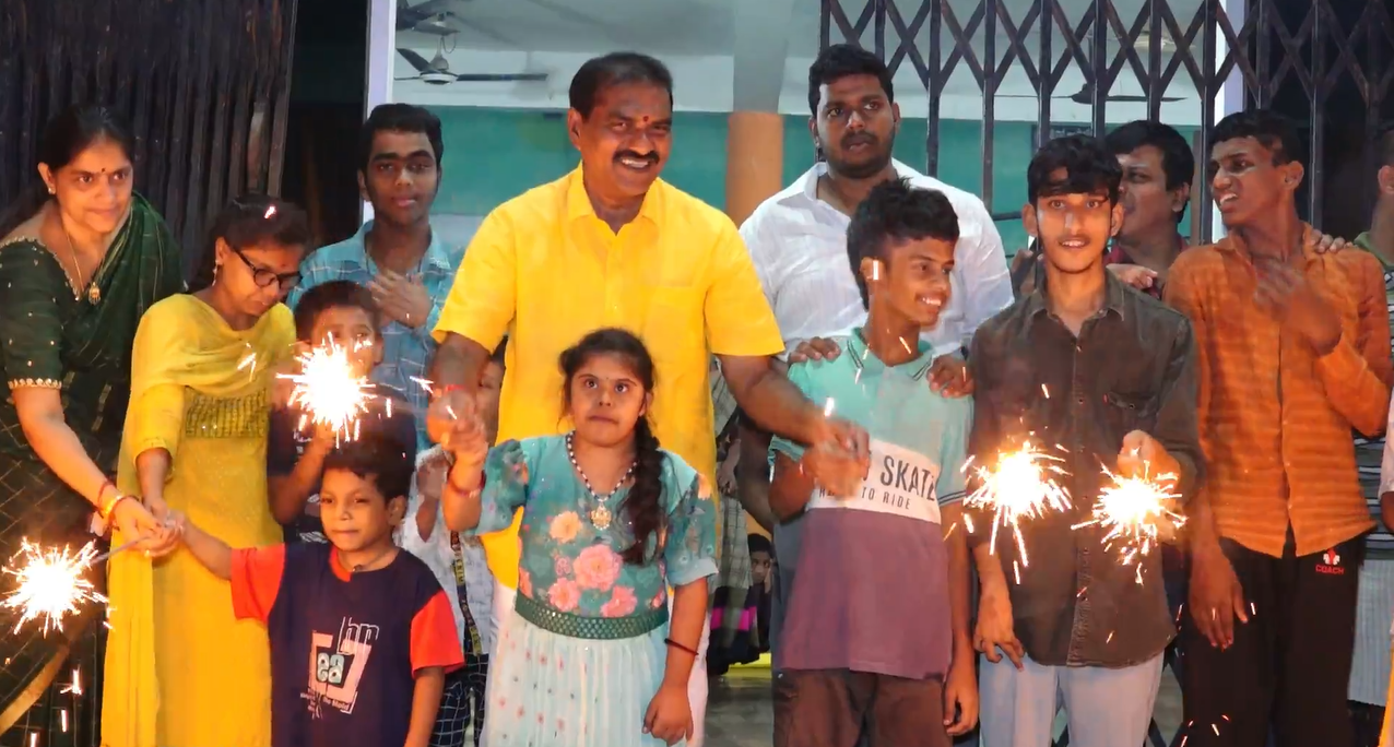 దీపావళి పండుగ సందర్భంగా రాష్ట్ర జలవనరుల శాఖామాత్యులు నిమ్మల రామానాయుడు పాలకొల్లు, పెనుమదం రోడ్డులోగల అంజలి మానసిక దివ్యాంగుల పాఠశాలను సోమవారం తమ కుటుంబ సభ్యులతో కలిసి సందర్శించారు. పాఠశాల విద్యార్థులకు దీపావళి శుభాకాంక్షలు తెలుపుతూ వారితో ముచ్చటించారు. నిమ్మల రామానాయుడు, సూర్యకుమారి దంపతులు వారి కుమార్తె శ్రీజపవన్ దంపతులు పాల్గొని విద్యార్థులకు బహుమతులు అందించారు. ఈ సందర్భంగా ఆ చిచ్చర పిడుగుల ముఖాల్లో వెల్లివిరిసిన ఆనందాల హరివిల్లు చూసి చిచ్చుబుడ్లు చిన్నబుచ్చుకొన్నాయి, మతాబులు ముఖం ముడుచుకున్నాయి. కుటుంబ సభ్యులంతా ప్రేమా, వాత్సల్యా లతో మిఠాయిలు నోటికి అందించితినిపించారు. గోమాతకు ఆహారం అందించారు. ఏటా జరిగే ఈ కార్యక్రమం ఈ ఏడాది అంజలి మానసిక దివ్యాంగుల పాఠశాల లో జరుపుకొన్నారు. ఇప్పుడు తన కుమార్తె తో పాటు అల్లుడు కూడా ఈ కార్యక్రమంలో పాల్గొనడంపట్ల సంతోషం వ్యకంచేశారు. పెద్ద మనసు చేసుకొని దివ్యాంగుల పాఠశాలకు దీపావళి పండుగలా వచ్చిన నిమ్మలను పలువురు అభినందించారు. ఈ కార్యక్రమంలో మాజీ కౌన్సిలర్ పెశ్చెట్టి బాబు తదితరులు పాఠశాల సిబ్బంది పాల్గొన్నారు