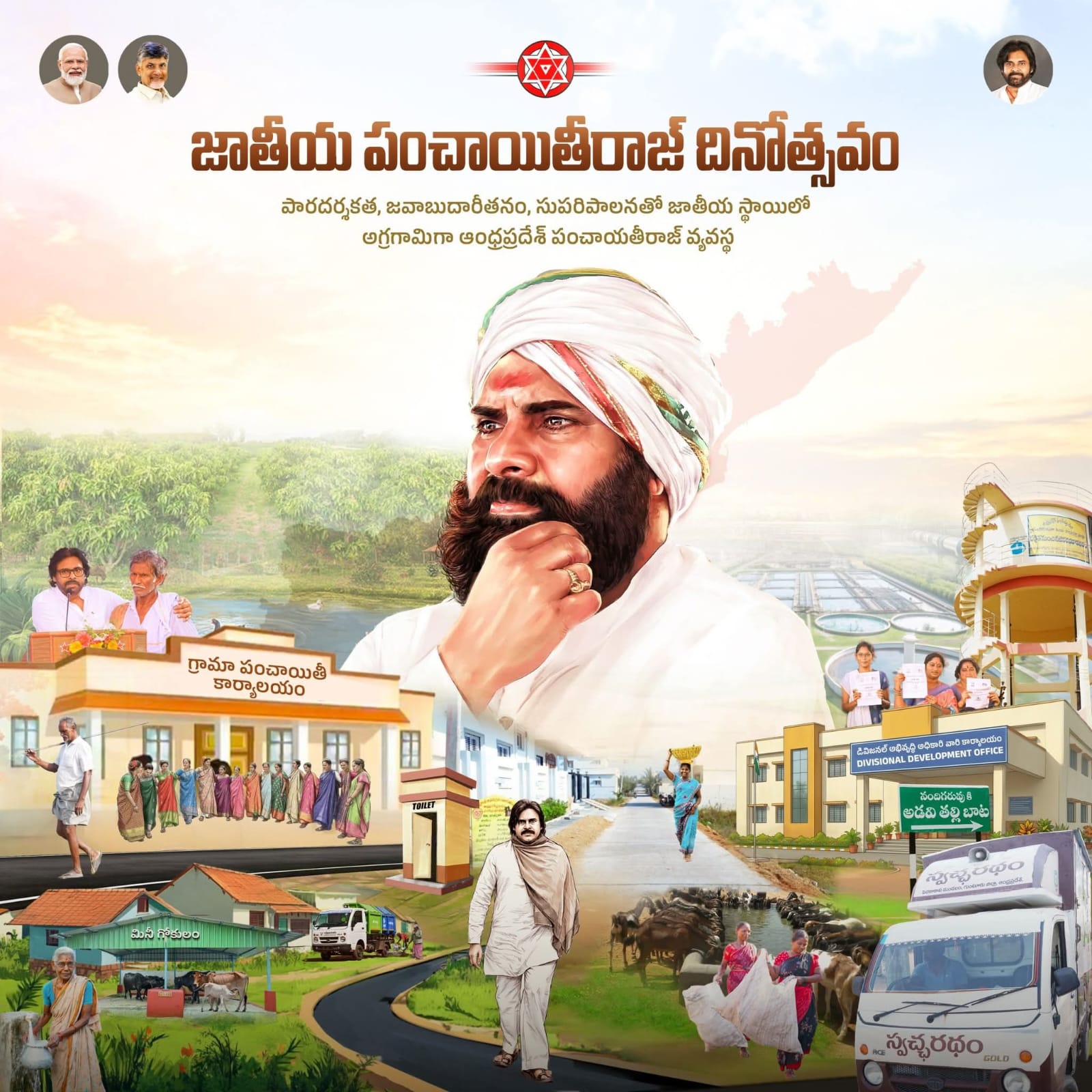 పవన్ కళ్యాణ్ గారు 22 నెలల్లో ఆ దిశగా గణనీయమైన ప్రగతి సాధించారు. గ్రామీణ పాలనలో జాతీయ స్థాయిలో ఆంధ్రప్రదేశ్ రాష్ట్రాన్ని అగ్రగామిగా నిలిపారు. ఈ జాతీయ పంచాయతీరాజ్ దినోత్సవాన కూటమి ప్రభుత్వం గ్రామీణాభివృద్ధిలో ఒక చారిత్రాత్మక దశకు చేరువయ్యింది. ఉప ముఖ్యమంత్రివర్యులు పవన్ కళ్యాణ్ దూరదృష్టితో కూడిన నాయకత్వంలో పంచాయతీ రాజ్, గ్రామీణాభివృద్ధి శాఖ ప్రతి అడుగులో అపూర్వ విజయాలు అందుకుంటోంది. రాష్ట్రీయ గ్రామ స్వరాజ్ అభియాన్ రెండేళ్లలో సాధించిన అభివృద్ధి అద్భుతం.