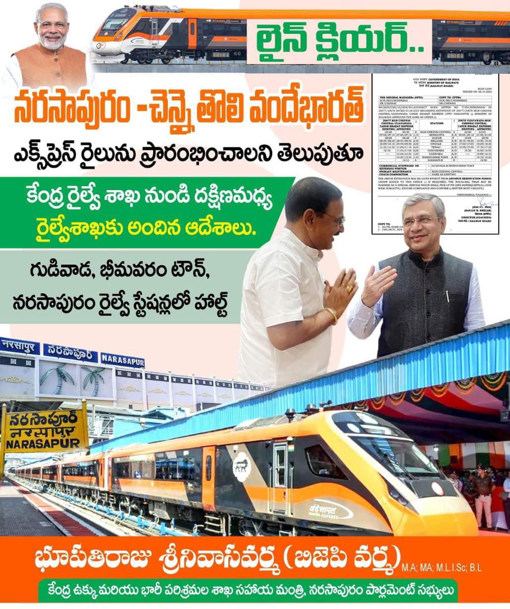 నరసాపురం పార్లమెంట్ సభ్యులు,కేంద్ర ఉక్కు ,భారీ పరిశ్రమల శాఖ సహాయ మంత్రివర్యులు భూపతి రాజు శ్రీనివాస్ వర్మ శుక్రవారం ముఖ్యమైన ప్రకటన చేశారు. ఎంజీఆర్ చెన్నై సెంట్రల్ నుంచి నరసాపురానికి వందే భారత రైలు రాబోతున్నట్టు వెల్లడించారు. దీంతో స్థానిక నాయకులు, ప్రజలు హర్షం వ్యక్తం చేస్తున్నారు. గతంలో కాంగ్రెస్ హయాంలో నరసాపురం – తిరుపతి, మచిలీపట్నం – బీదర్ తదిత రైళ్ళు అప్పటి మచిలీపట్నం ఎంపీ బాడిగ రామకృష్ణ వల్ల వచ్చాయి. ఆ తరువాత అమరావతి, అరుణాచలం రైళ్ళు వచ్చాయి. వందేభారత రైలు గతం నుంచి విజయవాడ వరకు నడుస్తుంది. ఇక్కడ నిలిపి ఉంచడం వల్ల ప్లాట్ఫారం ఖాళీ లేక ఇబ్బందులు ఎదురయ్యేవి. రైల్వే శాఖ ఈ రైలు నరసాపురం వరకు పొడిగించడం వల్ల ఈ ఇబ్బందిని అధిగమించవచ్చని ఆలోచన చేసింది. అయితే అమల్లోకి రాలేదు. కేంద్రమంత్రి వర్మ చొరవతో ఈ ప్రాజెక్టుకు చైతన్యం వచ్చింది. కేంద్ర రైల్వే మంత్రి అశ్విని వైష్ణవ్ తో కొన్నిసార్లు చర్చించి ఒప్పించారు. చెన్నై సెంట్రల్ నుంచి నరసాపురం వరకు వచ్చే ఈ రైలు నెంబరు 20677/ 20678. ఉదయం 5:30 గంటలకు చెన్నై ఎంజీఆర్ సెంట్రల్ రైల్వే స్టేషన్ నుంచి బయలుదేరి అదే రోజు మధ్యాహ్నం రెండు గంటల 10 నిమిషాలకు నరసాపురం చేరుకుంటుంది. మళ్ళీ మధ్యాహ్నం 2గంటల 50 నిమిషాలకు నరసాపురం లో బయలుదేరి రాత్రి 11గంటల 45నిమిషాలకు చెన్నై సెంట్రల్ చేరుతుంది. ఈనెల 6న రైల్వే శాఖ విడుదల చేసిన ప్రకటనలో ఎప్పటినుంచి ఈ రైలు నరసాపురం వరకు పొడిగిస్తారనేది, వారిచ్చిన ప్రకటనలో ఎక్కడ లేదు. సూత్రప్రాయంగా అంగీకరించినట్టు తెలుస్తుంది. పాలకొల్లు వ్యాపార, వాణిజ్య, ఆధ్యాత్మిక రంగాలకు సంబంధించిన ప్రముఖ పట్టణం. కోనసీమ జిల్లాకు వెళ్లేందుకు ఇక్కడి నుంచి కేవలం మూడు కిలోమీటర్ల దూరంలో చించినాడ వంతెనకు వెళ్ళే బైపాస్ రోడ్డు ఉంది. గల్ఫ్ దేశాలకు వెళ్లేవారూ ఎక్కువ. పాలకొల్లు ఆచంట వాటి చుట్టుపక్కల చాలా గ్రామాల ప్రజలు పాలకొల్లు కేంద్రంగా రాకపోకలు సాగిస్తారు. ఇంత ప్రాధాన్యత ఉన్న పాలకొల్లు రైల్వే స్టేషన్ లో వందే భారత్ రైలు ఆగుతుందని కూడా ఆ ప్రకటనలో ఎక్కడ పేర్కొనలేదు. మరో విషయం, ముఖ్యమైనది, అందరికీ కావలసిన సీట్లు,బెర్త్ ల సంగతి , రైల్వే శాఖ ఈ విషయంలో ఎక్కడా పట్టించుకున్నట్టు లేదు. నరసాపురం వరకు రైలు సర్వీస్ అయితే పొడిగించారు గాని ,కోచ్ కాంపొజిషన్లో మార్పులు ఏమి లేవని ప్రకటించారు. ఒక్క భోగి అయినా పెంచుతారా లేక అవే కోచ్ లతో లాగించేస్తూ, అందర్నీఅందులోనే పోటీ పడమంటారో తేలవలసి ఉంది. గత ఐదేళ్లలో నరసాపురం పార్లమెంటు నియోజకవర్గం అభివృద్ధి ఒక్క అంగుళం కూడా ముందుకు కదలలేదు. ఇప్పుడు శ్రీనివాస్ వర్మ ఎంపీ కావడం, అందులోనూ మంత్రి కావడం వల్ల అభివృద్ధి ఇక పట్టాలు ఎక్కవ వచ్చునని ప్రజలు ఆశాభావం వ్యక్