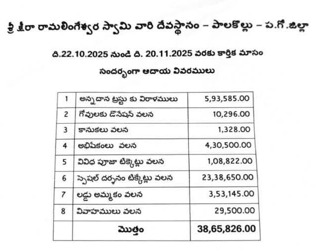 పాలకొల్లు నవంబర్ 21 తెలుగు న్యూస్ పేపర్ కార్తీక మాసం సందర్భంగా పంచాంగ క్షేత్రం పాలకొల్లు క్షీరా రామలింగేశ్వర స్వామి ఆలయం ఆలయానికి ఈ విమాసంలో(22 అక్టోబర్ నుంచి 20 నవంబర్ వరకు) వచ్చిన ఆదాయాన్ని ఈవో ముచ్చర్ల శ్రీనివాస్ వెల్లడించారు. వివిధప్రకటించారు. దాదాపు 8 మార్గంలో యాదయ్య ఆదాయం సంకురింది సమ కూరింది. ఈ మొత్తం 38 లక్షల 65 వేల 826 రూపాయల భూరి విరాళం భక్తుల అందించారు.