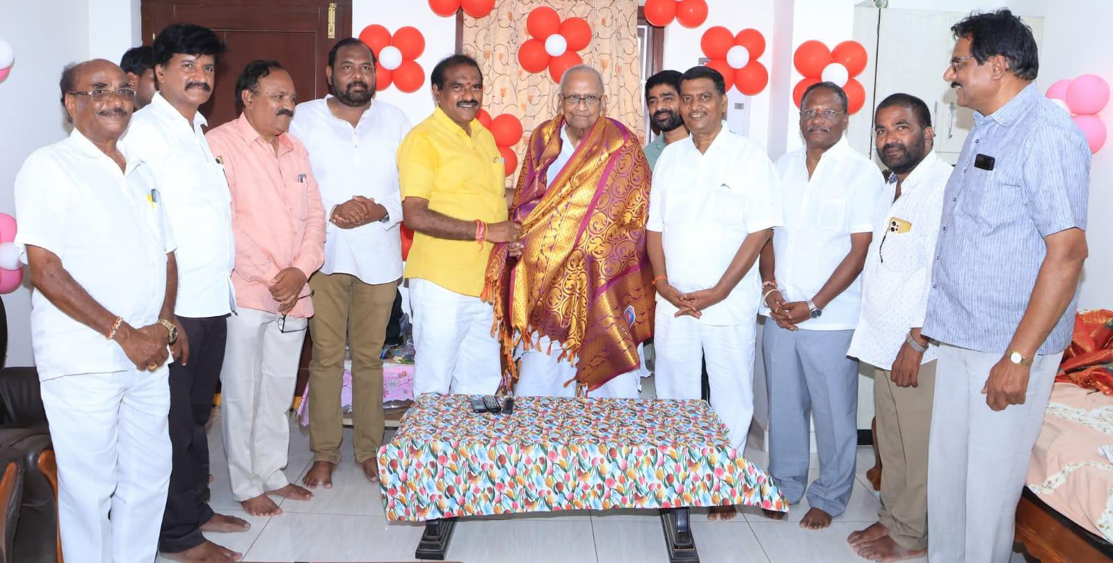 పాలకొల్లు: ఏప్రిల్, 5(తెలుగు న్యూస్ పవర్. కామ్) మాజీ మంత్రి, మాజీ ఎంపీ, రాజకీయ కురువృద్ధులు చేగొండి జోగయ్య 90వ పుట్టినరోజు సందర్భంగా, స్థానిక శాసనసభ్యులు, రాష్ట్ర జలవనరుల శాఖ మాత్యులు నిమ్మల రామానాయుడు స్వయంగా కలిసి, హరిబాబును సత్కరించి, పుట్టినరోజు శుభాకాంక్షలు తెలియజేశారు. వారి నుంచి నిమ్మల ఆశీస్సులు అందుకున్నారు. ఈ సందర్భంగా మంత్రి హరిబాబు యోగ క్షేమాలు అడిగి తెలుసుకున్నారు. ఈ కార్యక్రమంలో, మాజీ ఎమ్మెల్సీ అంగర రామ్మోహన్ రావు, గొట్టుముక్కల సూర్యనారాయణ రాజు, పెచ్ఛెట్టి బాబు, గండేటి వెంకటేశ్వరరావు, బోనం నాని, ఐజేయు నాయకులు, అల్లూరి సీతారామరాజు తిరుమలి ఇన్స్టిట్యూట్ అధ్యక్షులు ముత్యాల శ్రీనివాస్ తదితరులు పాల్గొన్నారు.
