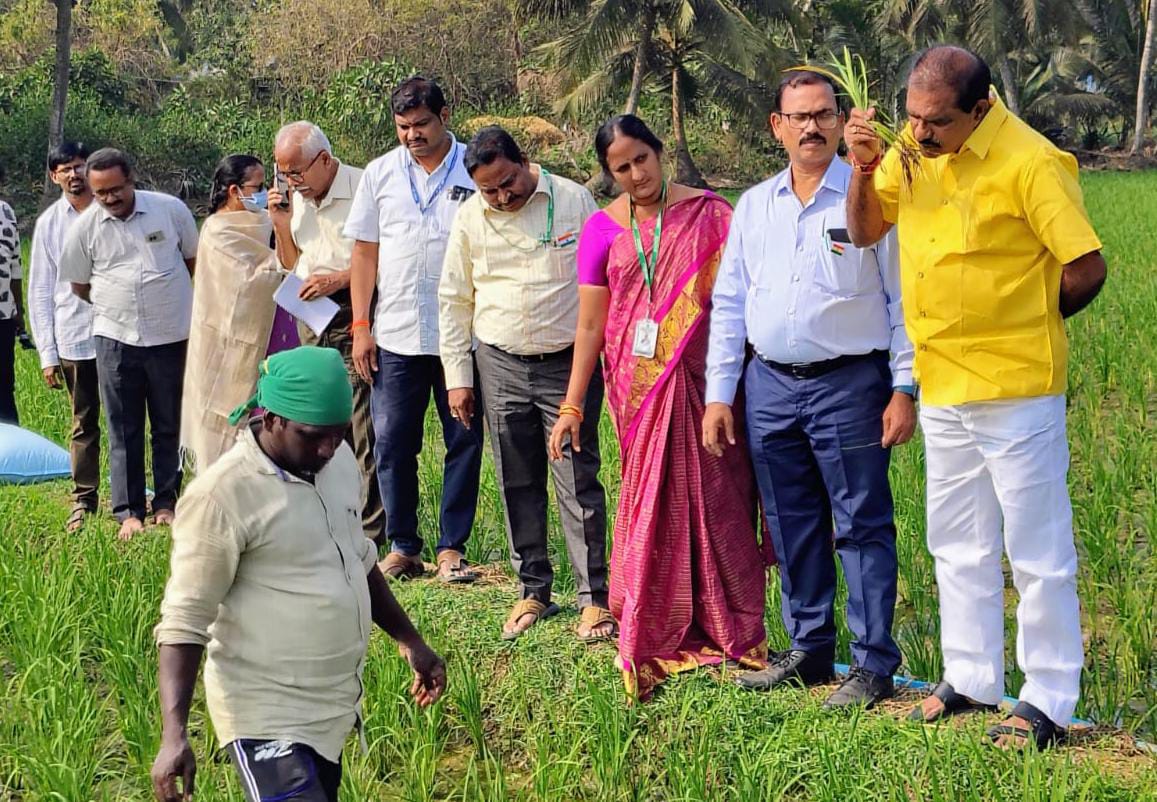 వ్యవసాయ అధికారులతో కలిసి వరిచేలు పరిశీలిస్తున్న మంత్రి నిమ్మల రామానాయుడు