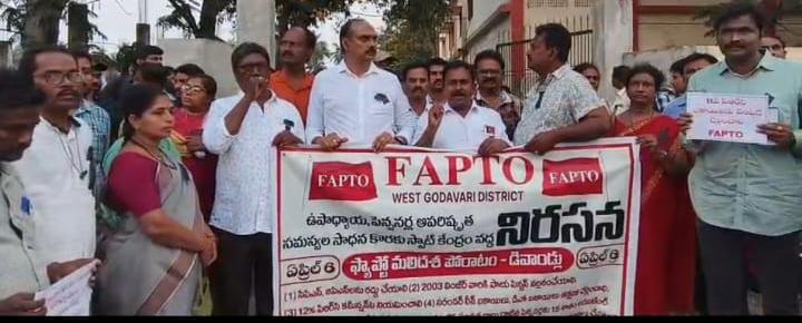 వీరవాసరం: ఏప్రిల్, 9(తెలుగు న్యూస్ పవర్. కామ్) ఫ్యాప్టో ఆధ్వర్యంలో వీరవాసరం 10వ తరగతి స్పాట్ కేంద్రం వద్ద గురువారం నిరసన కార్యక్రమం నిర్వహించారు. ప్రస్తుతం స్పాట్ వాల్యూషన్ విధానం ఉపాధ్యాయులను ఇబ్బందుల పాలు చేస్తుందని ఎమ్మెల్సీ బుర్ర గోపి మూర్తి ఆరోపించారు. డబ్బులలో నమోదు వల్ల సమస్యలు ఎదురై, పని పూర్తి చేయడానికి ఉపాధ్యాయులు ఎక్కువ సమయం కేటాయించాల్సి వస్తుందని తెలిపారు. ఫ్యాప్టో పిలుపు మేరకు ప్రస్తుతం రెండవ దశలో స్పాట్ కేంద్రాల వద్ద నిరసన కార్యక్రమం జరుగుతున్నట్టు తెలిపారు. 25 నుంచి 27 వరకు విజయవాడలో రిలే నిరాహార దీక్ష ఉద్యమం చేపడుతామని విజయరాజు వెల్లడించారు. వెంటనే పిఆర్సి నూతన కమిటీ నియమించాలని డిమాండ్ చేశారు. మధ్యంతర భృతి 30 శాతం చెల్లించాలని కోరారు. 11 పి ఆర్ సి బకాయిలు వెంటనే విడుదల చేయాలన్నారు. ఉపాధ్యాయులకు బకాయి పడ్డ వేల కోట్ల రూపాయలు చెల్లించాలని డిమాండ్ చేశారు. కారుణ్య నియామకాలు వెంటనే చేపట్టాలన్నారు. ఈ కార్యక్రమంలో ఎస్టియు రాష్ట్ర కార్యదర్శి లంకపల్లి సాయి శ్రీనివాస్, ఏపీ జెఎసి,యుటిఎఫ్ జిల్లా కార్యదర్శి పోలిశెట్టి క్రాంతి కుమార్, పలువురు ఫ్యాప్టో నాయకులు పాల్గొన్నారు.